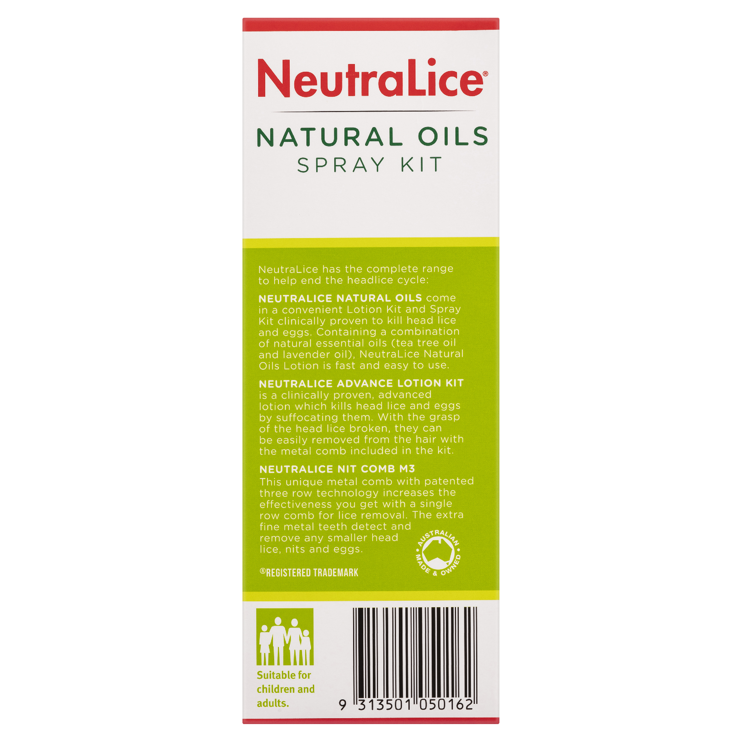 NeutraLice Natural Spray solutions contain a combination of tea tree oil and lavender oil (essential oils) which makes them pleasant smelling and ideal for children as well as the rest of the family. NeutraLice Spray are available in 200mL. The Natural Spray is ideal if you prefer the convenience of a spray application or to spray caps and other articles.