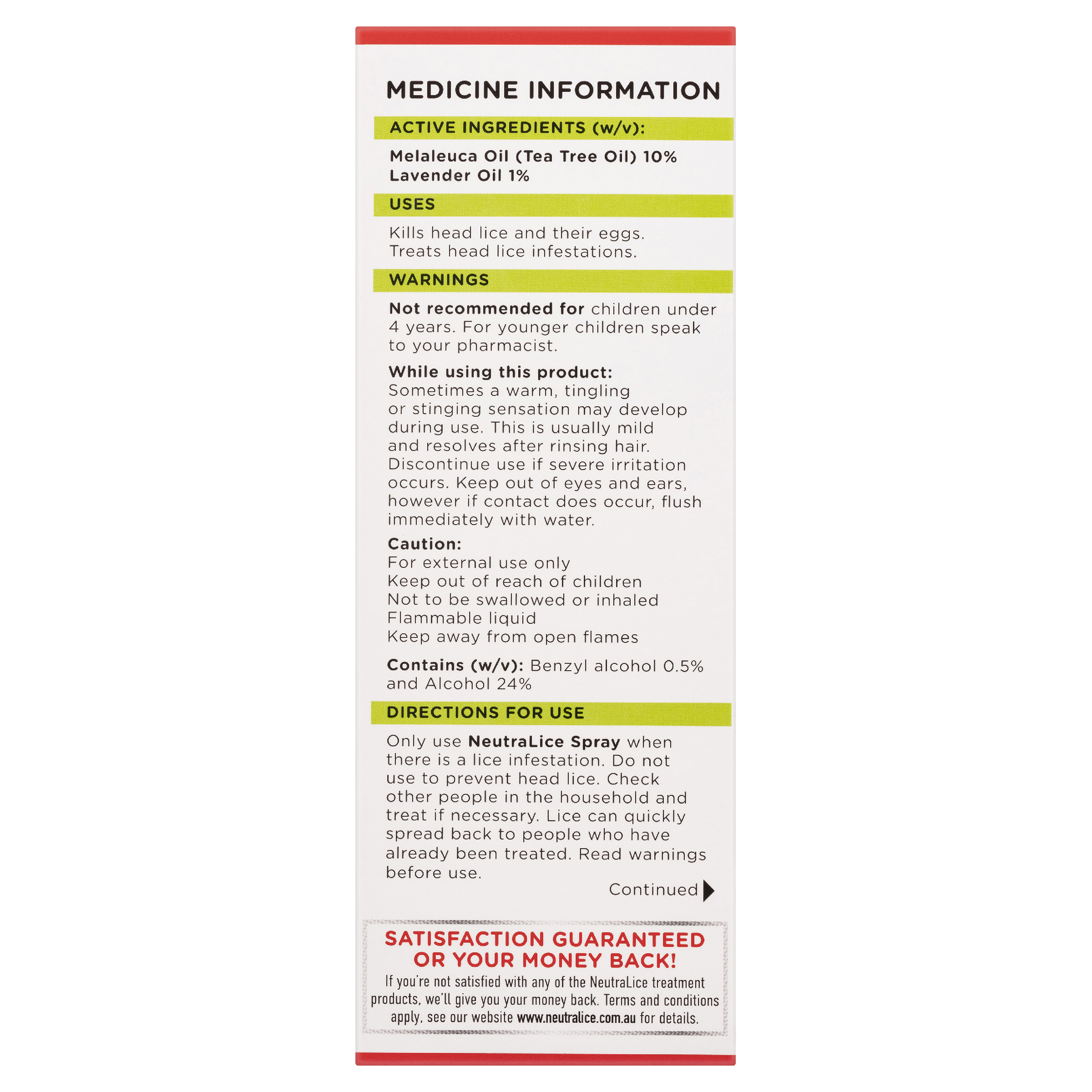 NeutraLice Spray Kits Active Ingredients (w/v): Melaleuca oil (Tea tree oil) 10%, Lavender oil 1%.